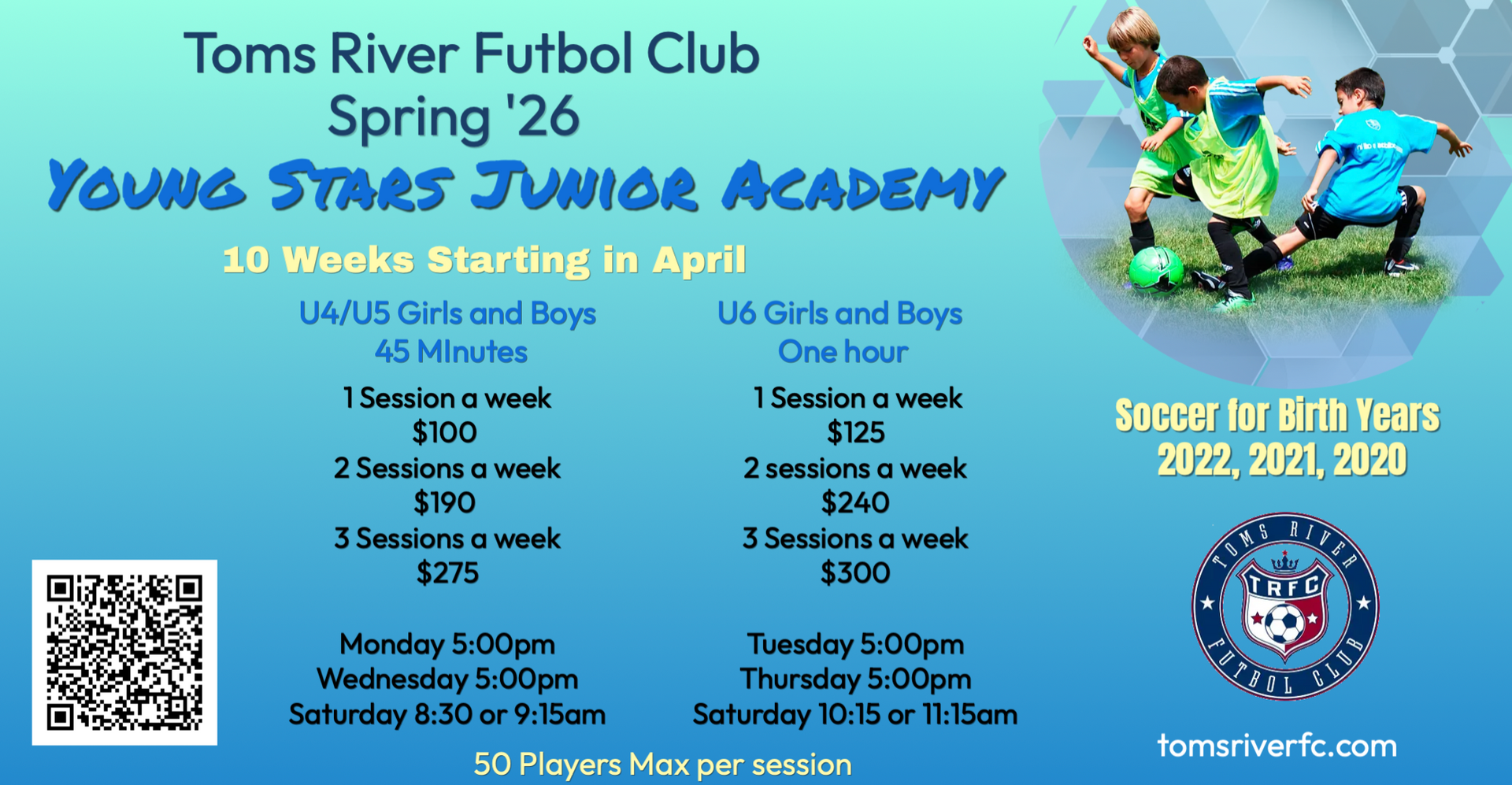 Boys and Girls U6 – sessions capped at 50 children – 1 Hour Sessions
